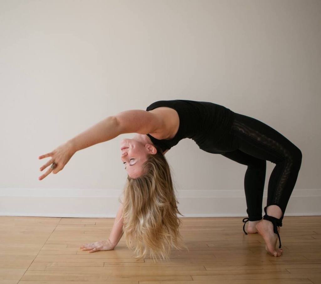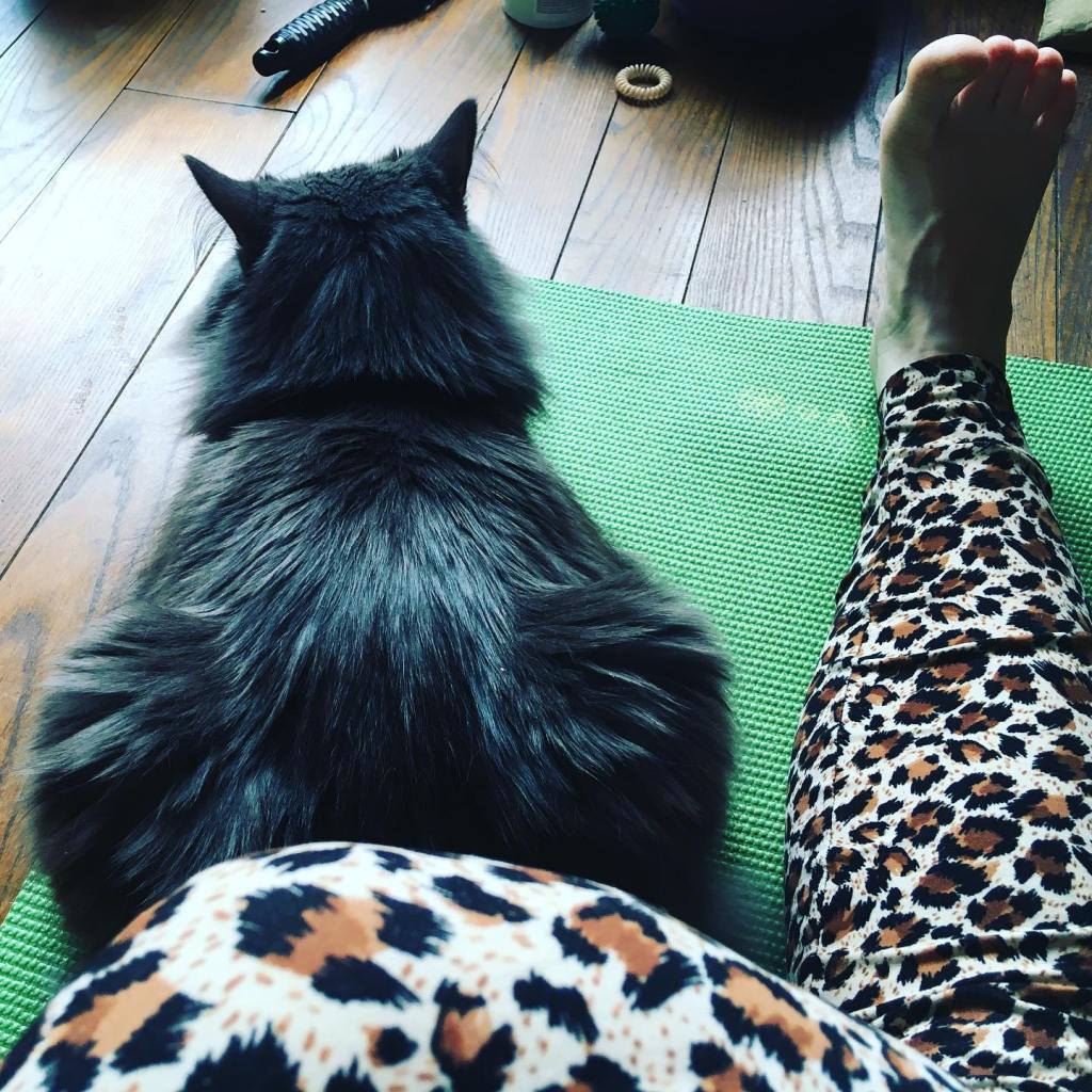 Off the mat you can find her strolling through a farmer’s market or the woods, having a dance party, or snuggling with her cat Smooshie (who often makes cameos in her online classes).